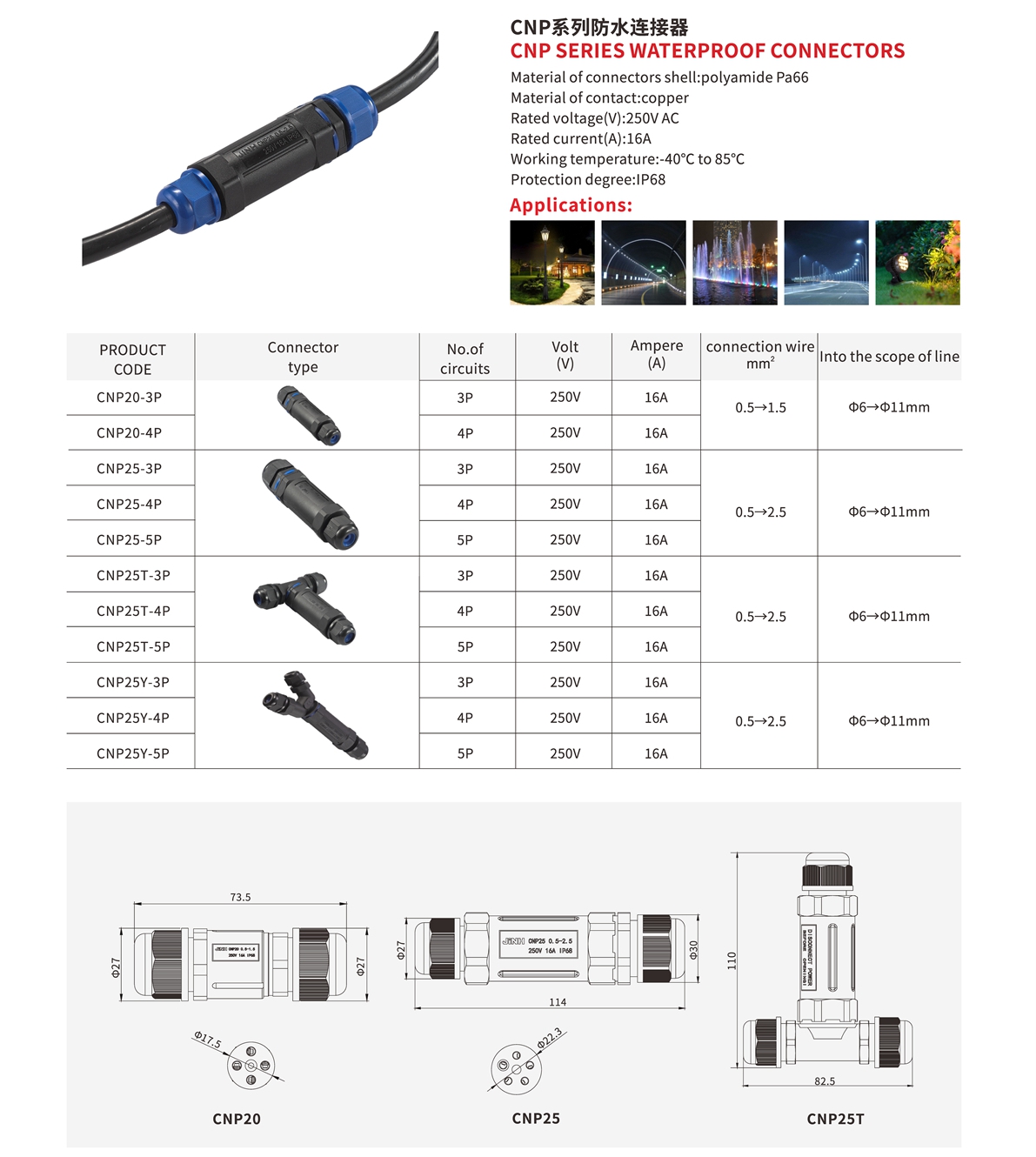 CNP20戶外防水接線端子采用螺絲壓接結(jié)構(gòu),主體螺旋式鎖緊,特殊設(shè)計的夾緊模及橡膠件,抗拉伸能力超強,適用線徑0.5-1.5mm2 的連接線使用,有三芯,四芯兩種可供選擇,防水防塵,耐鹽、酸、堿、醇、脂及一般溶劑。防水等 級IP68 可在水下十米內(nèi)線路連接以及潮濕環(huán)境下使用還能保證良好的導電性和防水性。