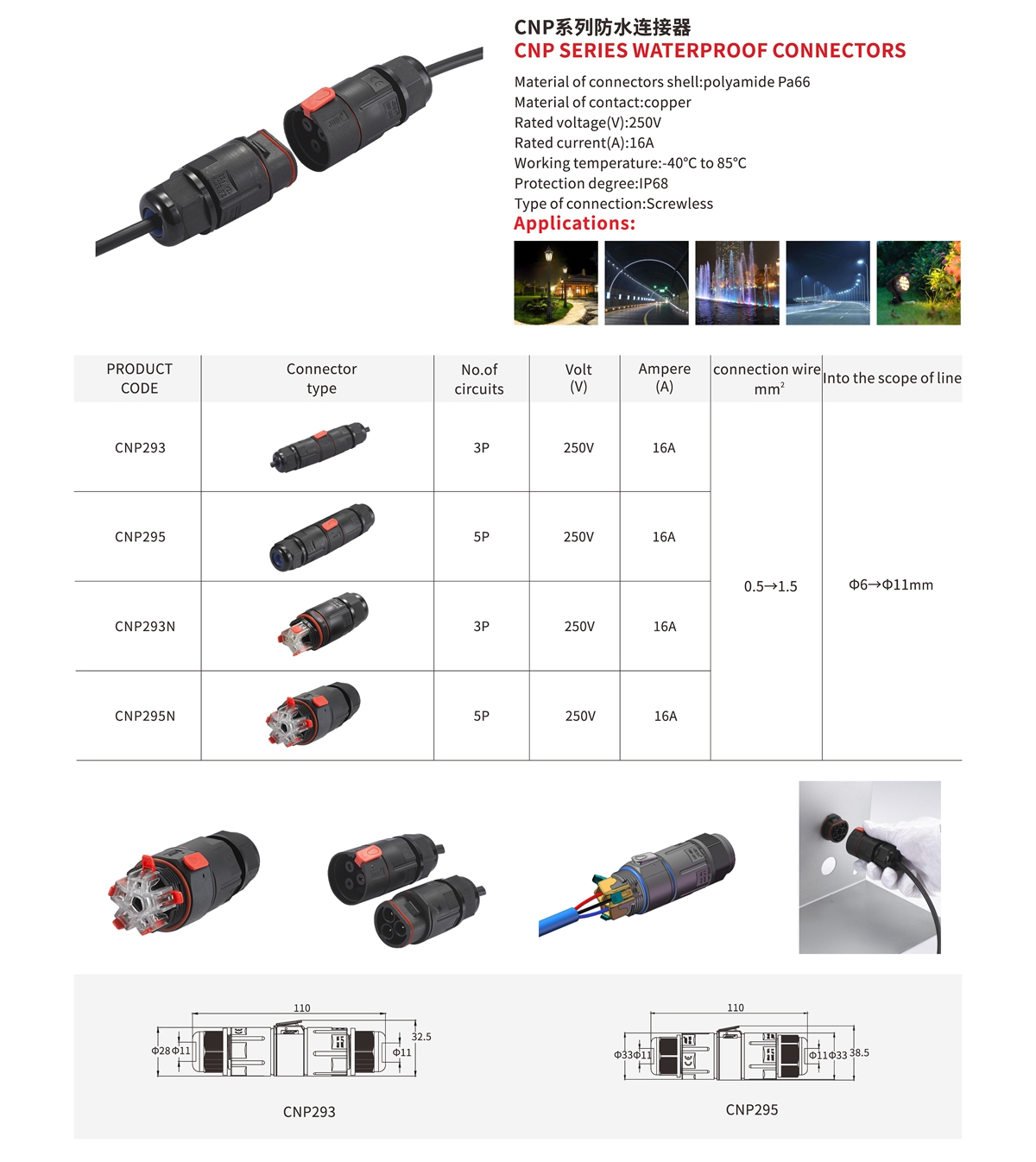 CNP293插拔式防水連接器防水等級(jí)IP68,三芯接線(xiàn),可接線(xiàn)平方范圍0.5-1.5平方。產(chǎn)品具有快速連接式功能,無(wú)需螺絲金屬連接,只需要打開(kāi)手柄插入導(dǎo)線(xiàn)后按下手柄復(fù)原即可連接,產(chǎn)品用途廣泛,替代性強(qiáng),可用于戶(hù)內(nèi)戶(hù)外工程設(shè)備作業(yè),在工程作業(yè)中有插拔需求的均可使用本產(chǎn)品,本產(chǎn)品使用便簡(jiǎn),安全可靠。