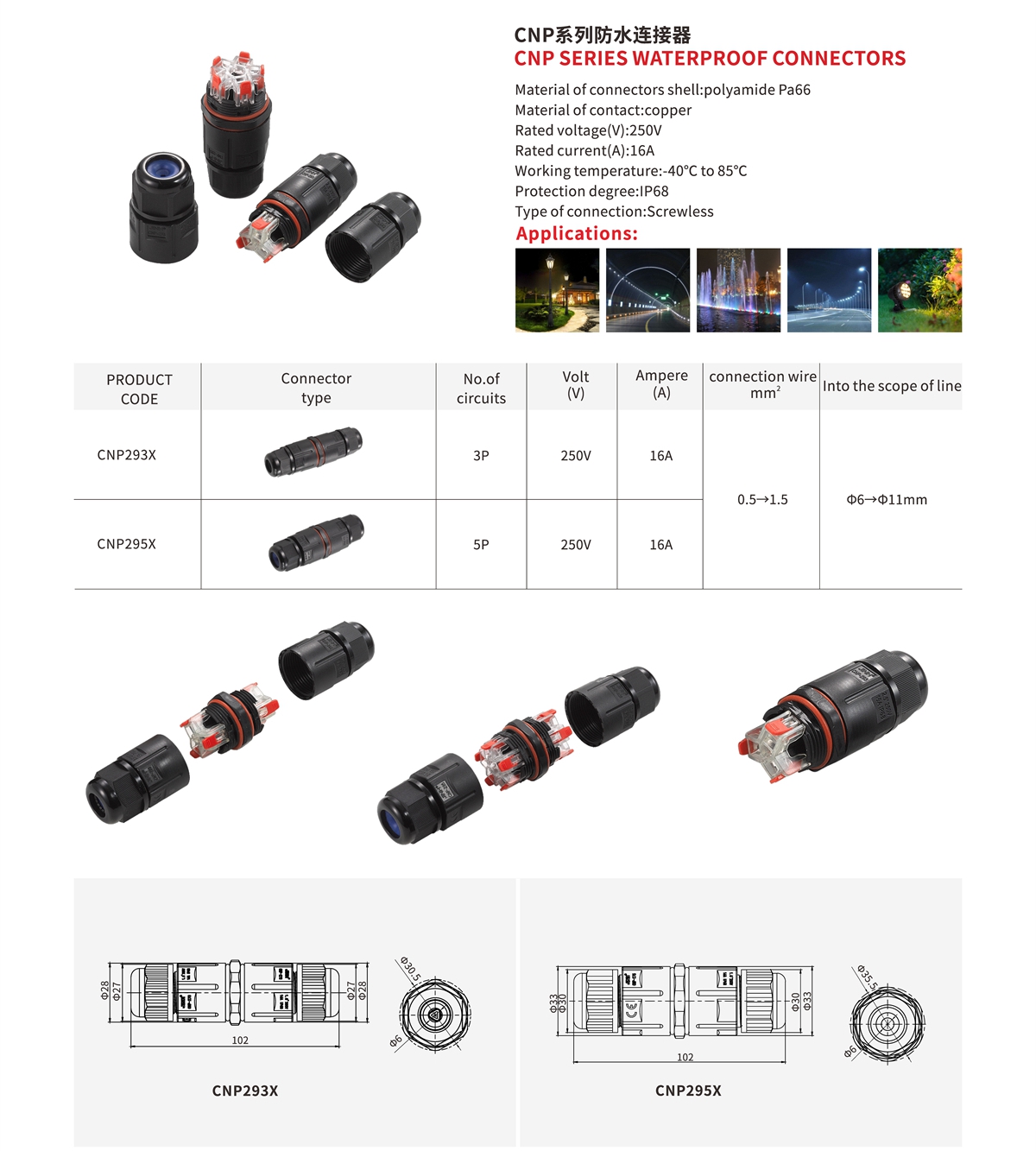 CNP293X 三芯分體式連接器 由京紅自主研發(fā)生產(chǎn)并提交了專利認(rèn)證,做為螺旋式防水連接器的另一升級款,適用于0.5-1.5mm2